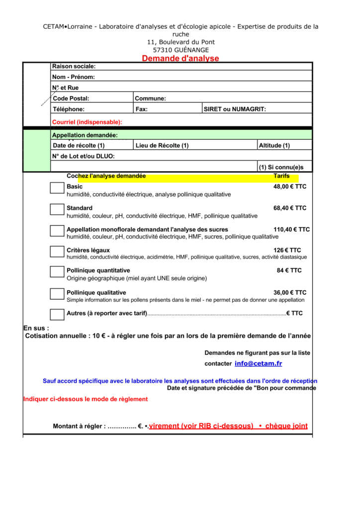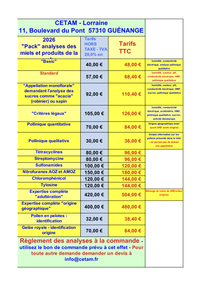 5 • Pour toute demande d’analyse autres que celles figurant dans le pack ou pour toutes conditions spéciales (concours, envoi en nombre, etc…) contacter le laboratoire à info@cetam.fr pour l’obtention d’un devis.